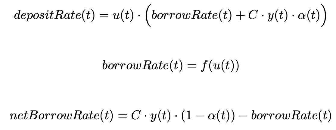 이 때 y(t) 는 bAsset 의 스테이킹 이율, C는 평균 담보 비율이며 α(t) 는 예금주에게 지불하는 스테이킹 이율의 비율이다. 직관적으로, 대출자가 예금자에게 지급한 비율은 bAsset 의 블럭 보상을 담보 비율로 곱한 동적 비율에 의해 보상된다. 또한 우리는 netBrorrowRate(t) 가 대출자가 지불한 bAsset 이자의 비중(유입) 뿐 아니라, 대출자가 예금주에게 지급한 비율(유출)도 포함한다는 점에 주목한다. netBorrowRate(t) 는 양수일 수도 있고 음수일 수도 있다.