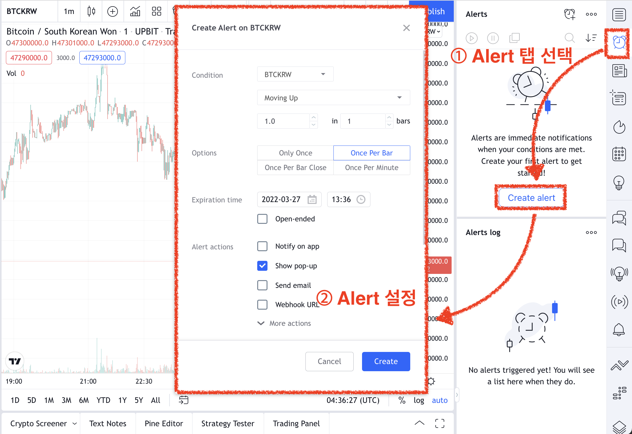 1분 봉 차트에서 차트 오른쪽 상단에서 시계 아이콘을 클릭하면 Alerts 패널이 나타납니다.