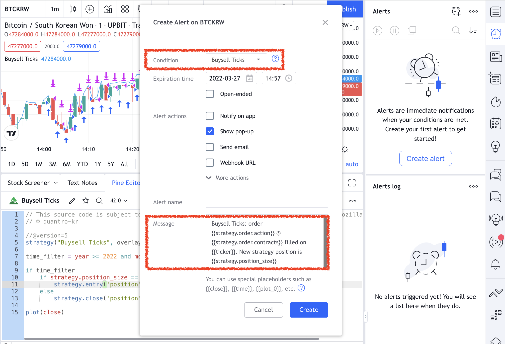 이제 트레이딩 뷰의 [ Alert ] 메뉴에서 [ Create Alert ] 버튼을 누르고, 팝업 창에서 [ Condition ] 을 방금 저장한 "Buysell Ticks" 로 선택하면 화면이 다음과 같이 표시됩니다 :