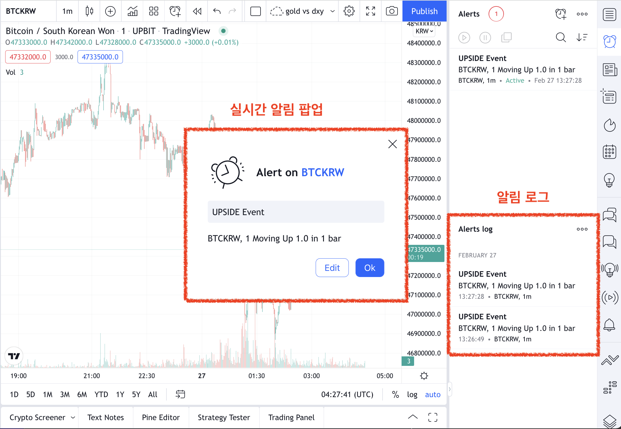 그림 2와 같이 트레이딩 뷰 화면에서는 알림 팝업이 뜨고, 알림 로그에 기존 알림 이력이 쌓입니다.