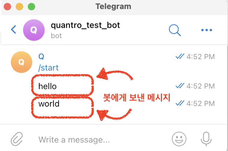 "hello", "world" 메시지를 차례로 보내면 화면은 아래 그림과 같을 것입니다: