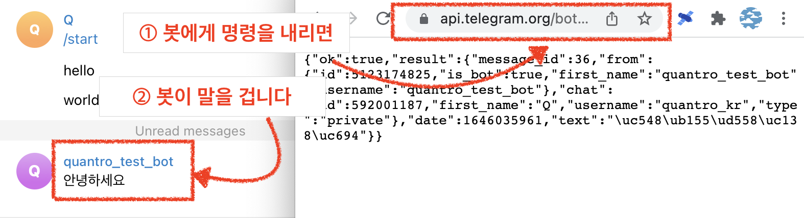 좌측은 텔레그램 대화방, 우측은 브라우저 화면입니다. 브라우저에서 API 를 호출하면 text 로 넘겨받은 값(안녕하세요)으로 봇이 나와의 대화방에서 말을 겁니다.