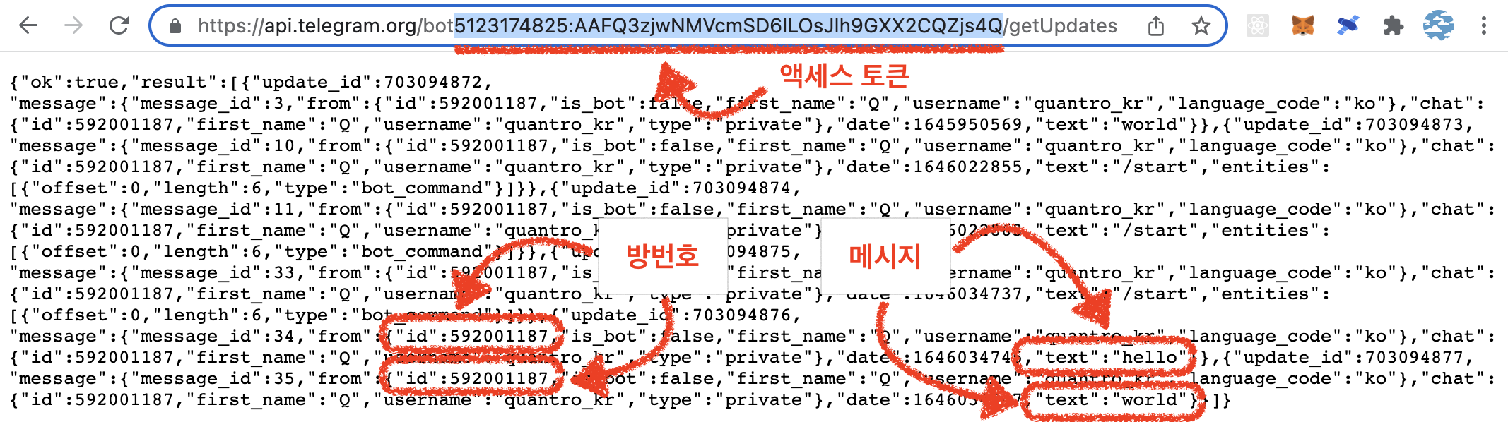 위의 예에서 액세스 토큰 값 5123174825:AAFQ3zjwNMVcmSD6lLOsJlh9GXX2CQZjs4Q , 방 번호 592001187 을 이용해서 브라우저 주소창에 다음 주소를 입력합니다 :