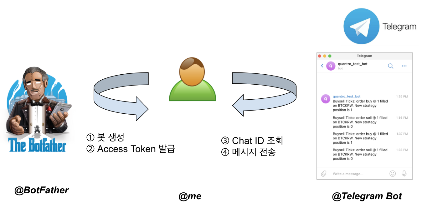 텔레그램에서 메시지를 받기 위해서는 우선 텔레그램 계정이 필요하고, 나에게 메시지를 보내줄 상대가 필요합니다. 사람이 아닌 가상의 서비스가 메시지를 보내주게 되는데, 이러한 서비스를 '봇(bot)' 이라고 부릅니다. 이러한 봇을 통해 텔레그램 메시지를 받는 시나리오는 다음과 같이 네 단계로 구분해볼 수 있습니다 :