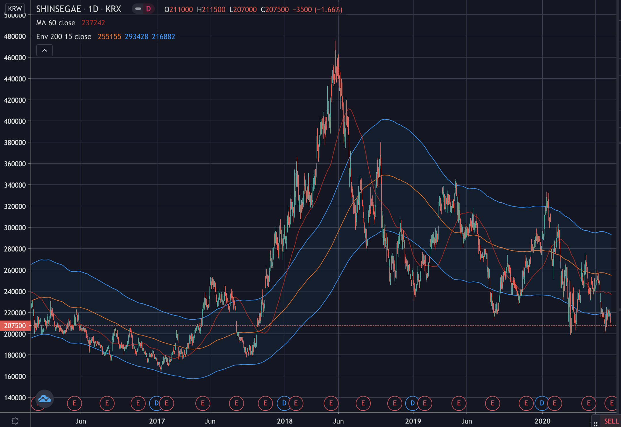 연초의 코로나 사태에 따른 최저점에 거의 근접한 절대적인 낙폭과대 상태입니다. 신세계는 그다지 분석이 필요한 종목은 아니지요.