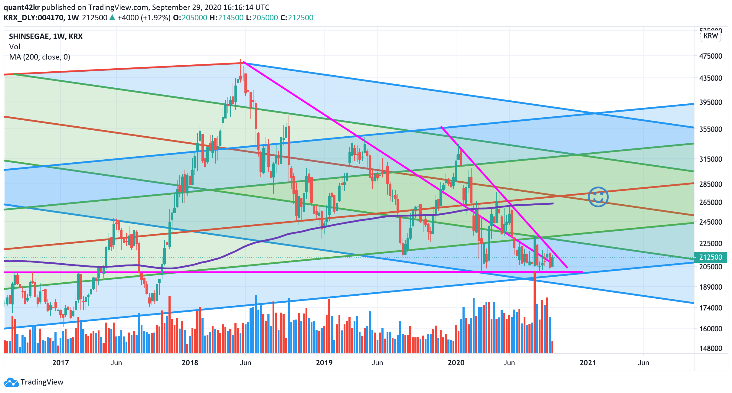 차트를 그리고 보니 꽤나 중요한 지점에 와있는 것 같습니다. 주가는 20만원을 지지선으로 하면서 수렴하고 있습니다. 한 번 시세가 났는데 이를 지키지 못하고 다시 하락한 가운데... 다시 한 번 강한 시세가 나지 않는다면 꽤나 어려운 구간이 될 수도 있겠습니다.