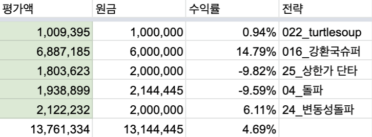 그런데 위 수익률을 단순 평균하면 0.5% 남짓인데 실 수익률은 4.7% 인 이유가 뭘까요? 수익률이 좋은 전략에 더 많은 금액이 투자되어 있기 때문입니다. 위 전략은 모두 100만원에서 출발한 계좌들이고, 추가 투자는 일정한 수익이 발생하면 피라미딩으로 추가한 금액입니다. 아까 수익률이 코스닥에 한참 미치지 못한다고 했는데, 원금 추가에 따른 희석을 감안하지 않으면 실질 수익률은 이보다 높습니다. 예를 들어 원금 600 이 들어있는 두 번째 계좌의 실질 수익률은 30% 정도 됩니다.