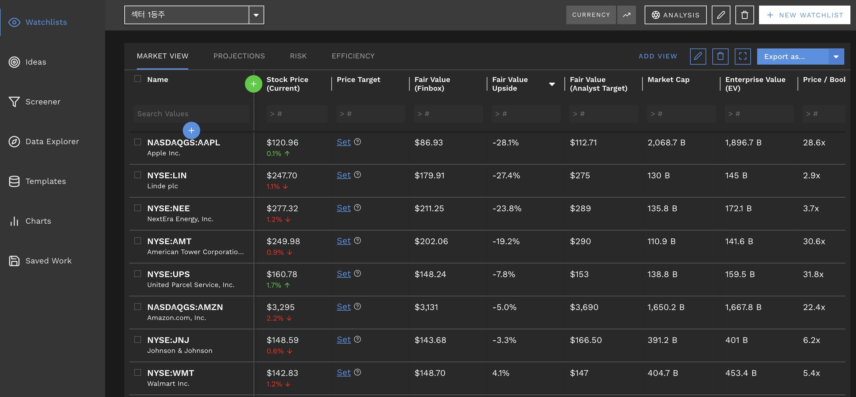 - Watchlists : 포트폴리오를 만들고, 종목별 지표를 지정합니다. finbox 에서 제공되는 지표는 1160개 정도 되는데, 이 중 필요한 것만 뽑아서 컬럼으로 만들면 이를 VIew 라고 부릅니다. 아래 이미지에서는 Market View, Projections, Risk, Efficiency 모두 4 가지 뷰가 기본적으로 만들어진 것을 확인할 수 있습니다. 여기에 추가하거나 뷰의 컬럼을 변경할 수 있습니다.