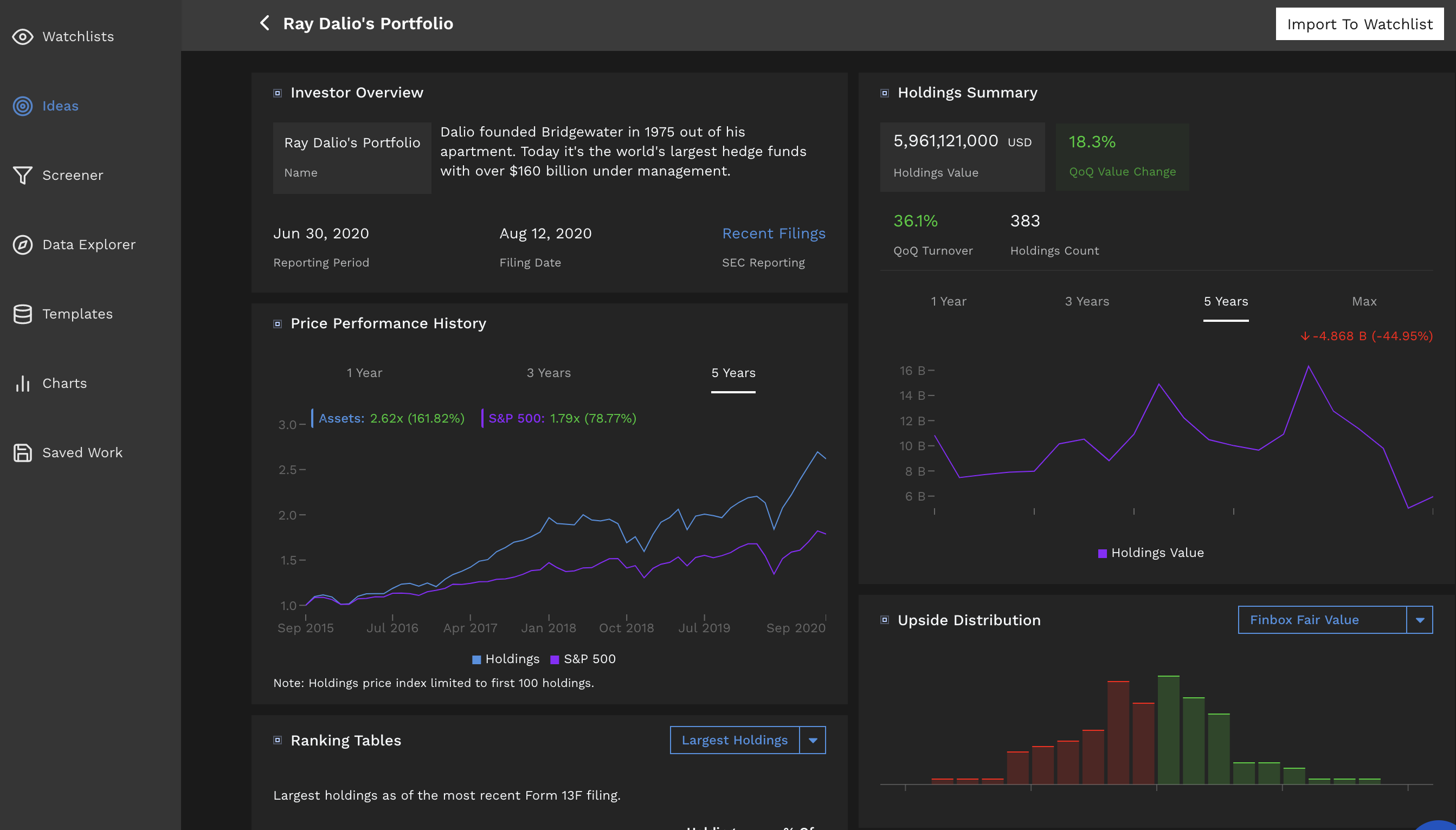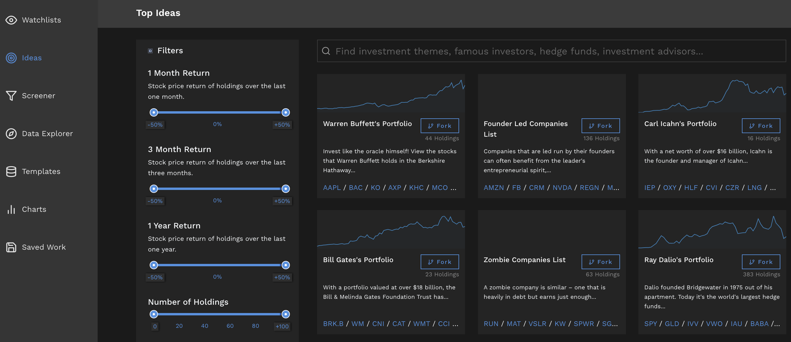 - Ideas : 유명한 포트폴리오를 검색하고, 마음에 드는 포트폴리오가 있으면 자신의 Watchlist 로 등록할 수 있습니다. 워렌 버핏, 레이 달리오 같은 네임드의 펀드도 확인할 수 있는데, 아마도 미국 증권 거래위원회에 제출하는 자료로부터 포트폴리오를 입수하고 이를 반영한 것으로 보입니다.