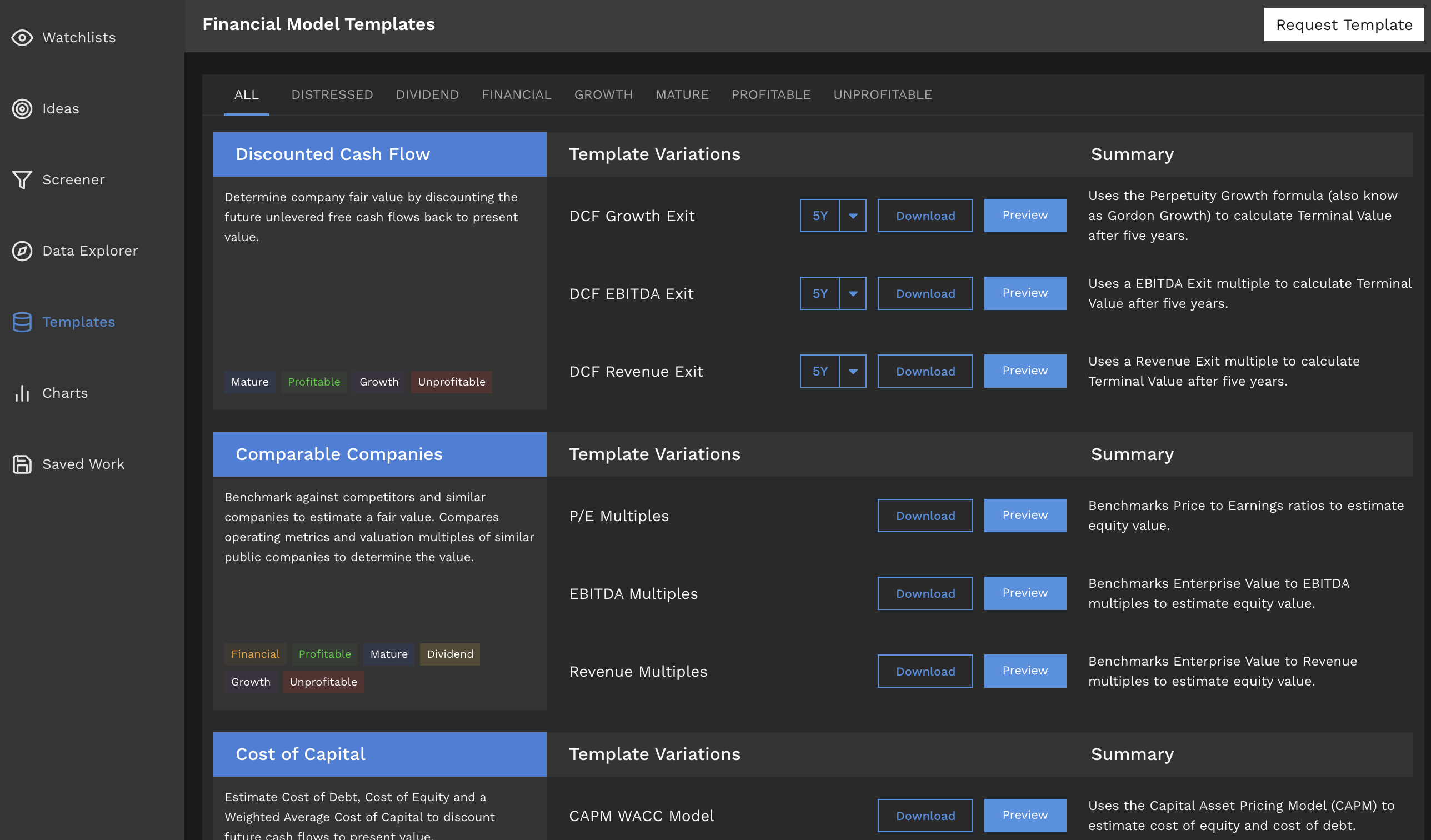 - Templates : 엑셀이나 구글 시트에서 finbox 의 Add-on 함수를 호출해서 수학적 모델을 구하는 템플릿을 제공합니다. 말로 하니 복잡한데, 현금흐름할인법을 이용한 가치평가 모델, PER 을 이용한 적정 가치 산출 등을 계산할 수 있는 기능이라고 보면 됩니다.