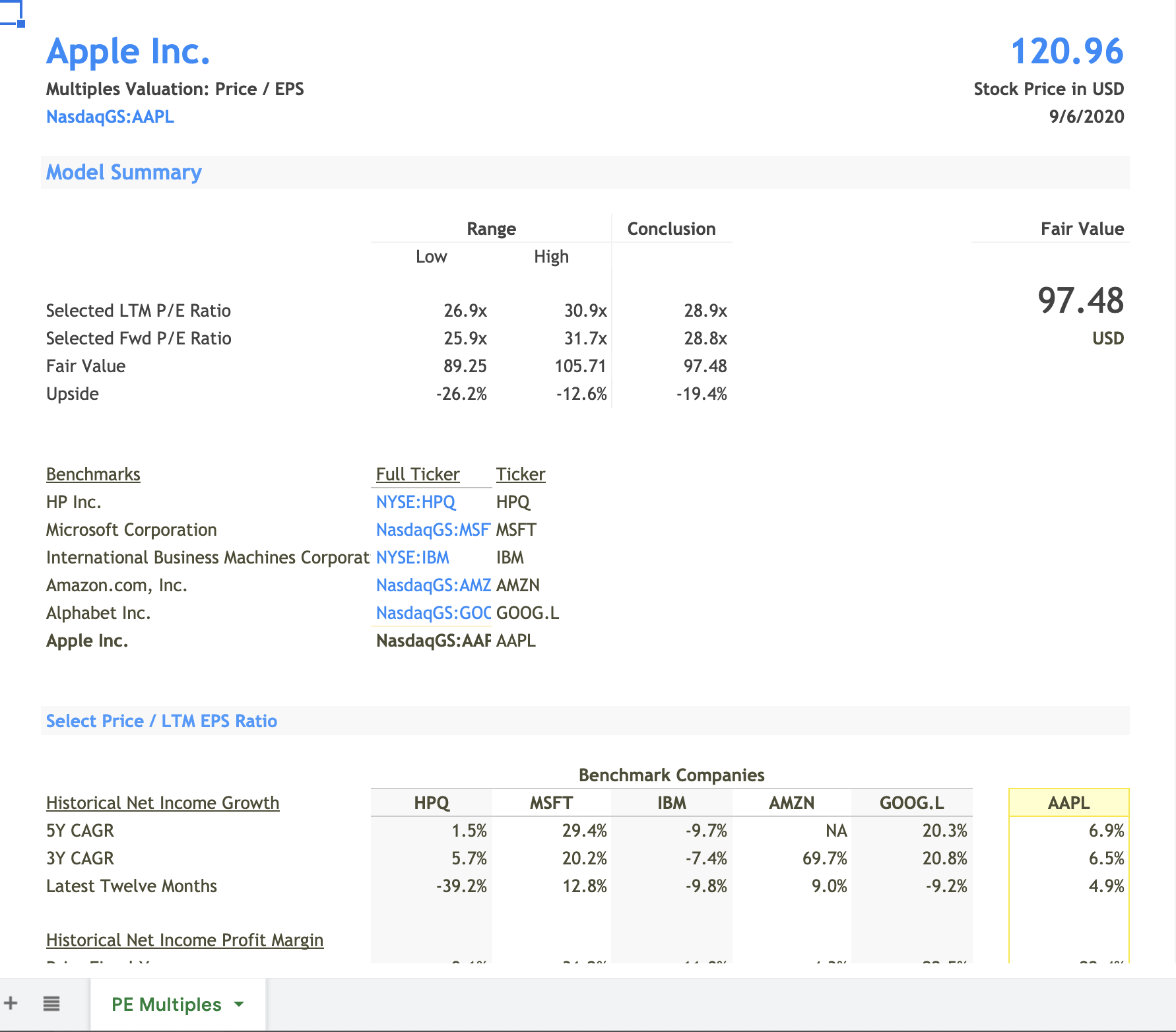 P/E Ratio 를 이용한 멀티플 산출 템플릿을 구글 시트로 받아서, 애플에 적용해본 결과입니다. 주가는 $120.96 인데 적정가는 $97.48 로 나와서 19.4% 과대평가 되어 있다고 나오는군요.