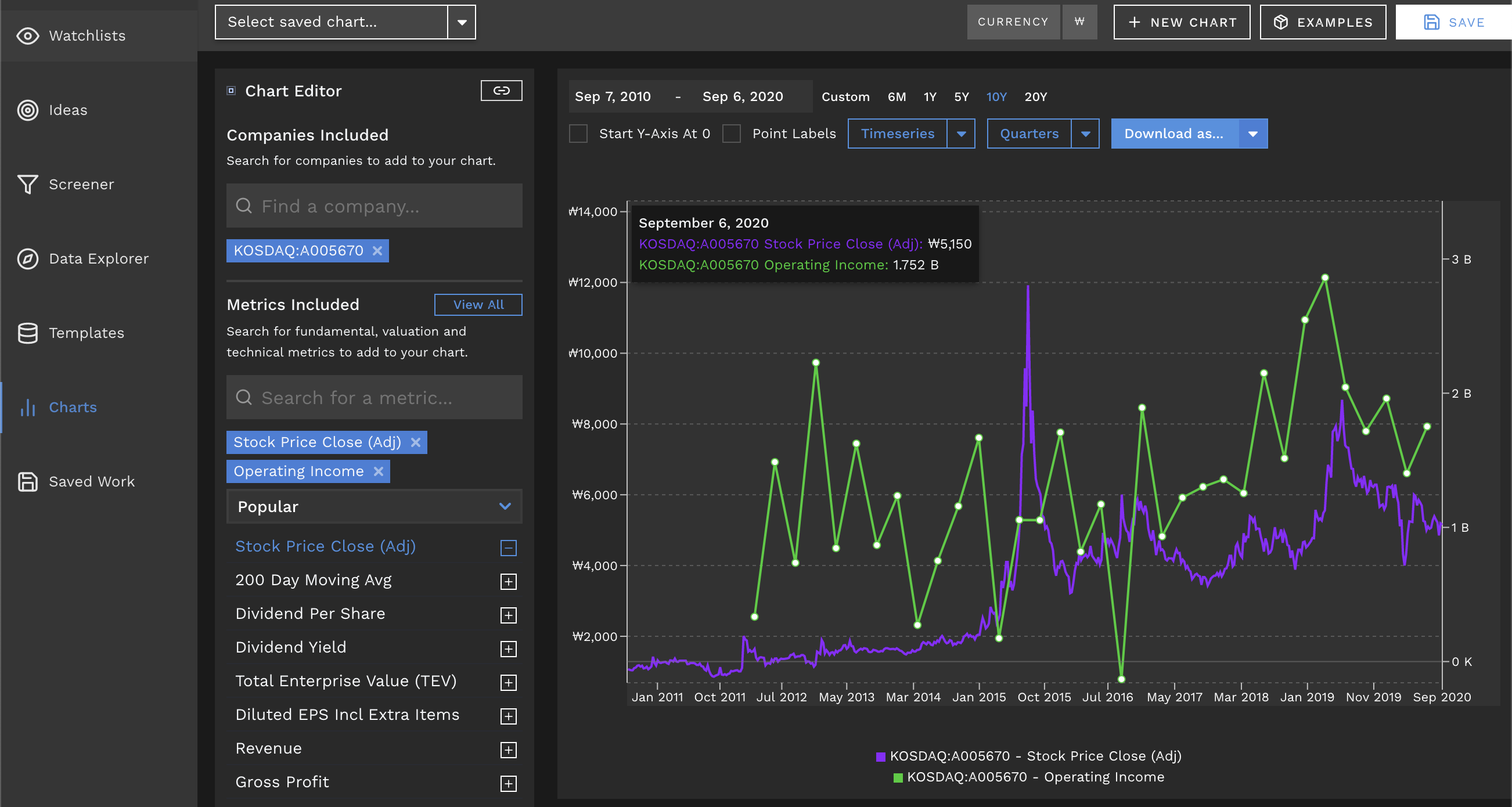 - Charts : 종목에 여러 지표를 적용해서 그래프를 볼 수 있습니다. 아래는 푸드웰(국내 주식도 됩니다)에 주가와 영업이익을 적용한 시계열 그래프입니다.