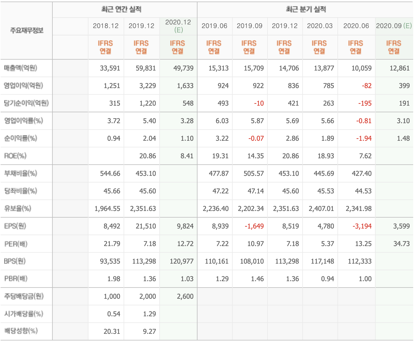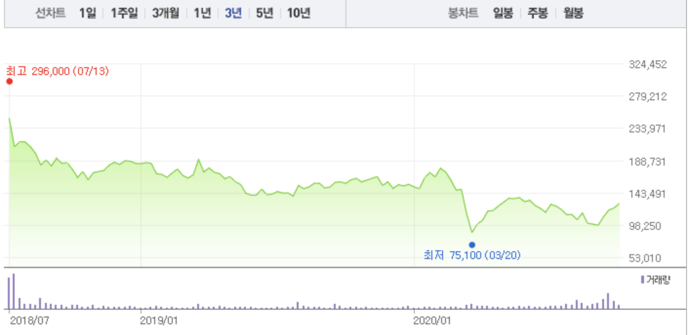 매수 이유는 단순합니다. 코로나로 인한 낙폭 과대. 20년도 이익이 1천억대로 예상되는 시점에 시가총액이 5천억이므로 멀티플이 5 수준으로 과도했습니다. 이는 7월 기준 예상치였고, 당시 2Q 영업이이이 717억으로 예상되었는데 실제로는 82억 적자로 나와서 주가는 96400원까지 하락했습니다. 20년 추정 영업이익도 3022억에서 1633억으로 반토막이 났습니다.