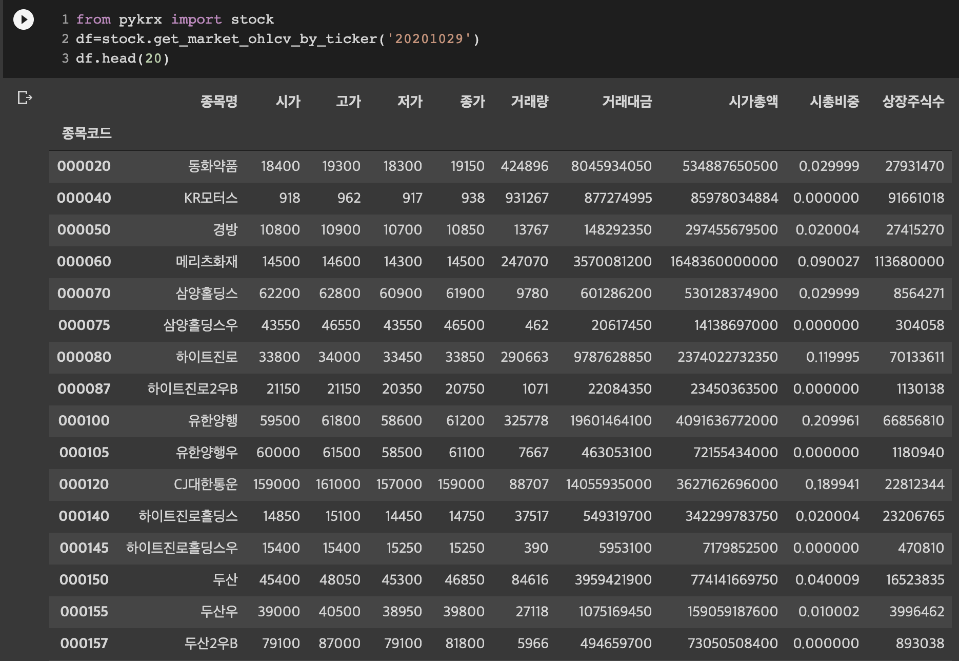 주가 및 종목 조회는 이전과 마찬가지로 pykrx 패키지를 이용했습니다.
