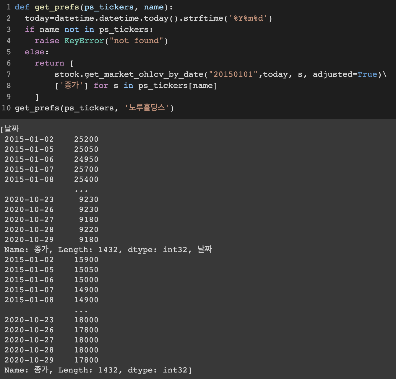 이제 위 딕셔너리로부터 종목명을 입력받아서, 본주와 우선주 등에 대해 2015년 1월 1일부터 오늘 날짜까지의 종가 Dataframe 을 구한 리스트를 리턴하는 함수를 정의합니다.