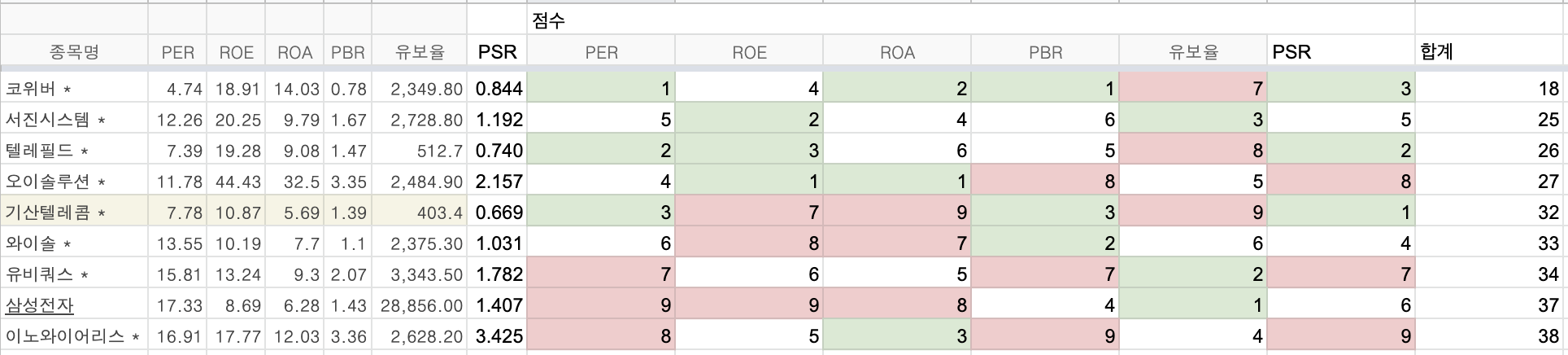 - 일단 전 종목 모두 6점 이상입니다. 물론 코위버는 3위 안에 드는 항목이 4개 이상이지만, 유보율이 너무 낮은게 걸렸습니다. 이는 텔레필드도 마찬가지.